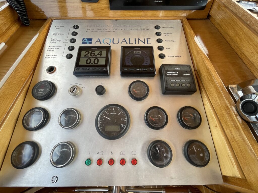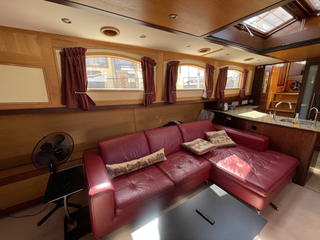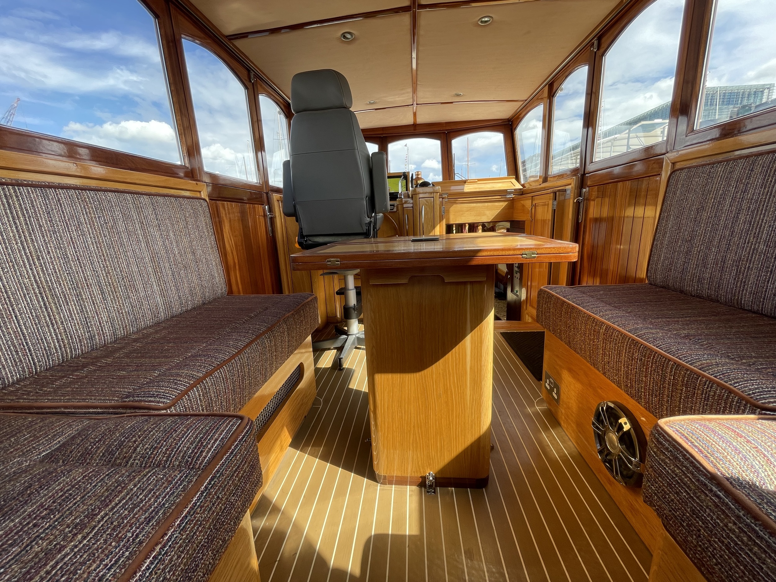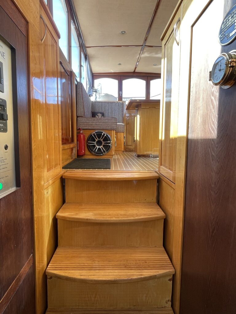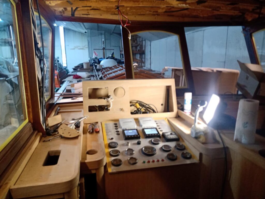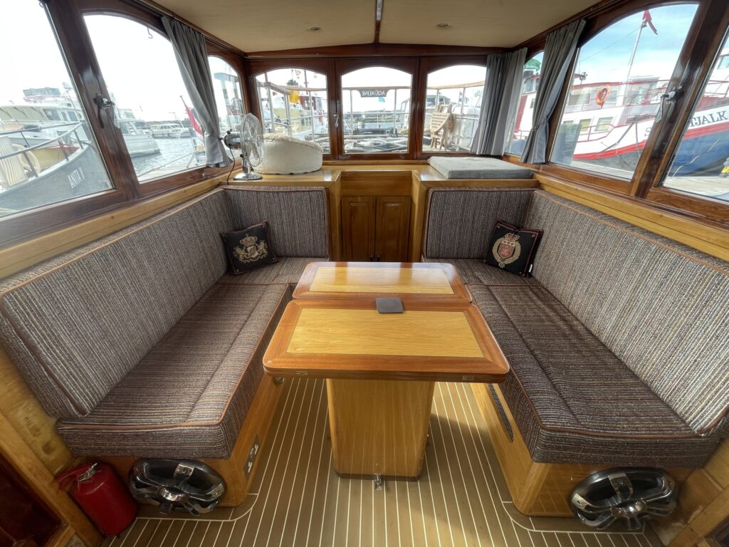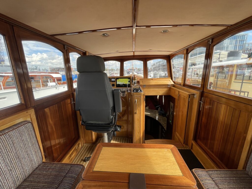 De ruime stuurhut werd in 2025 volledig vernieuwd met nieuw houtwerk, plafond, isolatie, bekabeling en moderne navigatieapparatuur, waaronder een Garmin-plotter met radar, AIS, marifoon en dieptemeter. De salon is sfeervol ingericht met een leren zithoek, houtkachel, grote ramen en een open keuken met granieten werkblad, 4-pits gasstel, oven, magnetron en koelkast/vriezer.