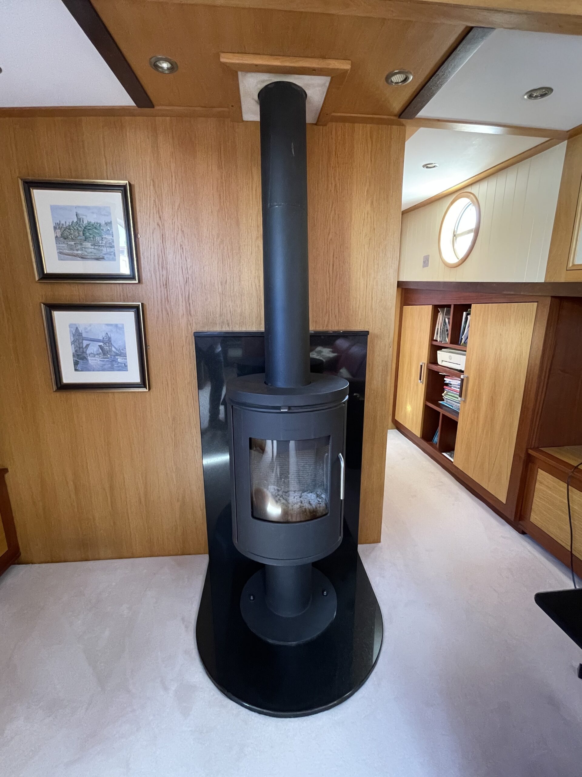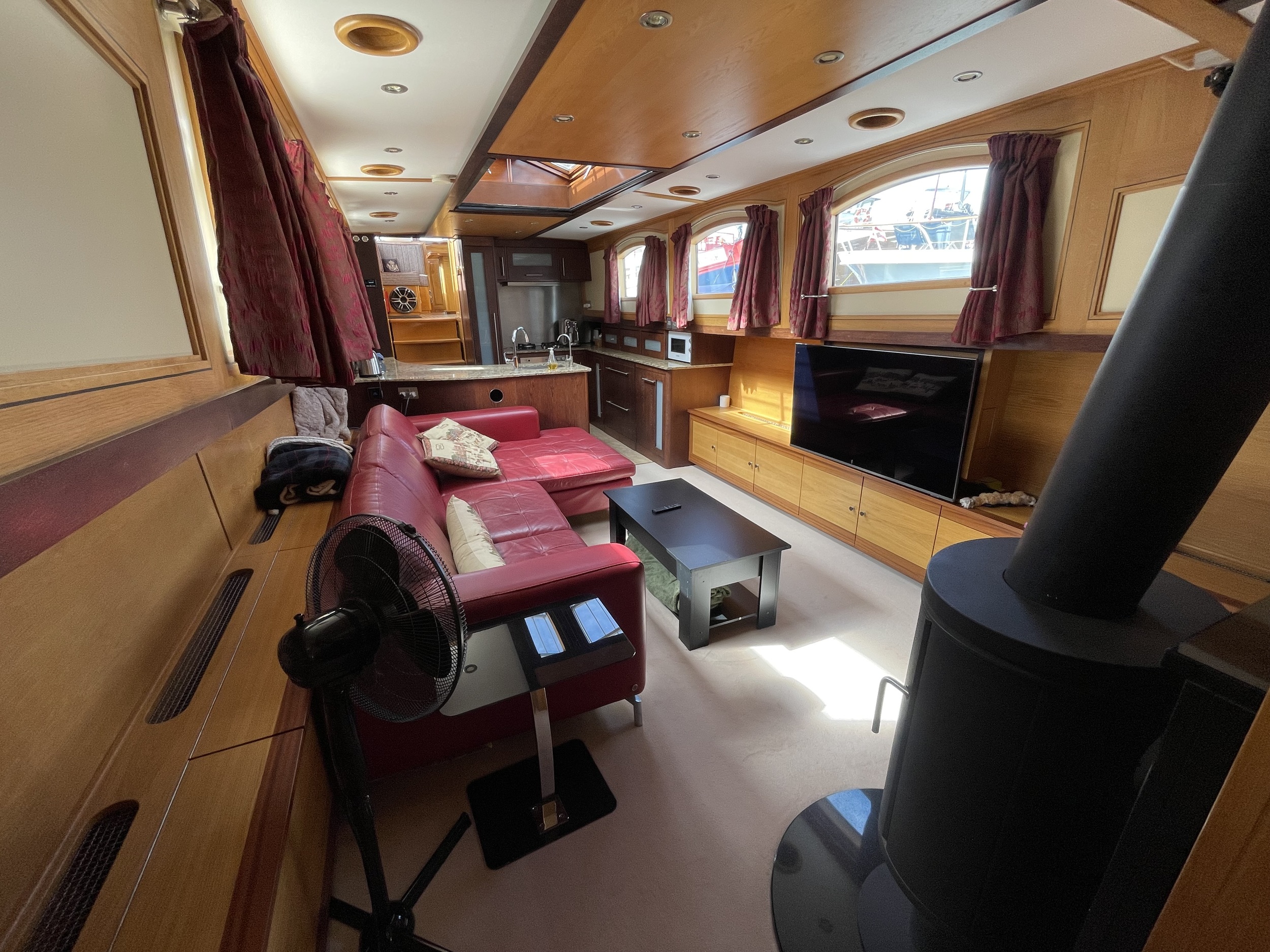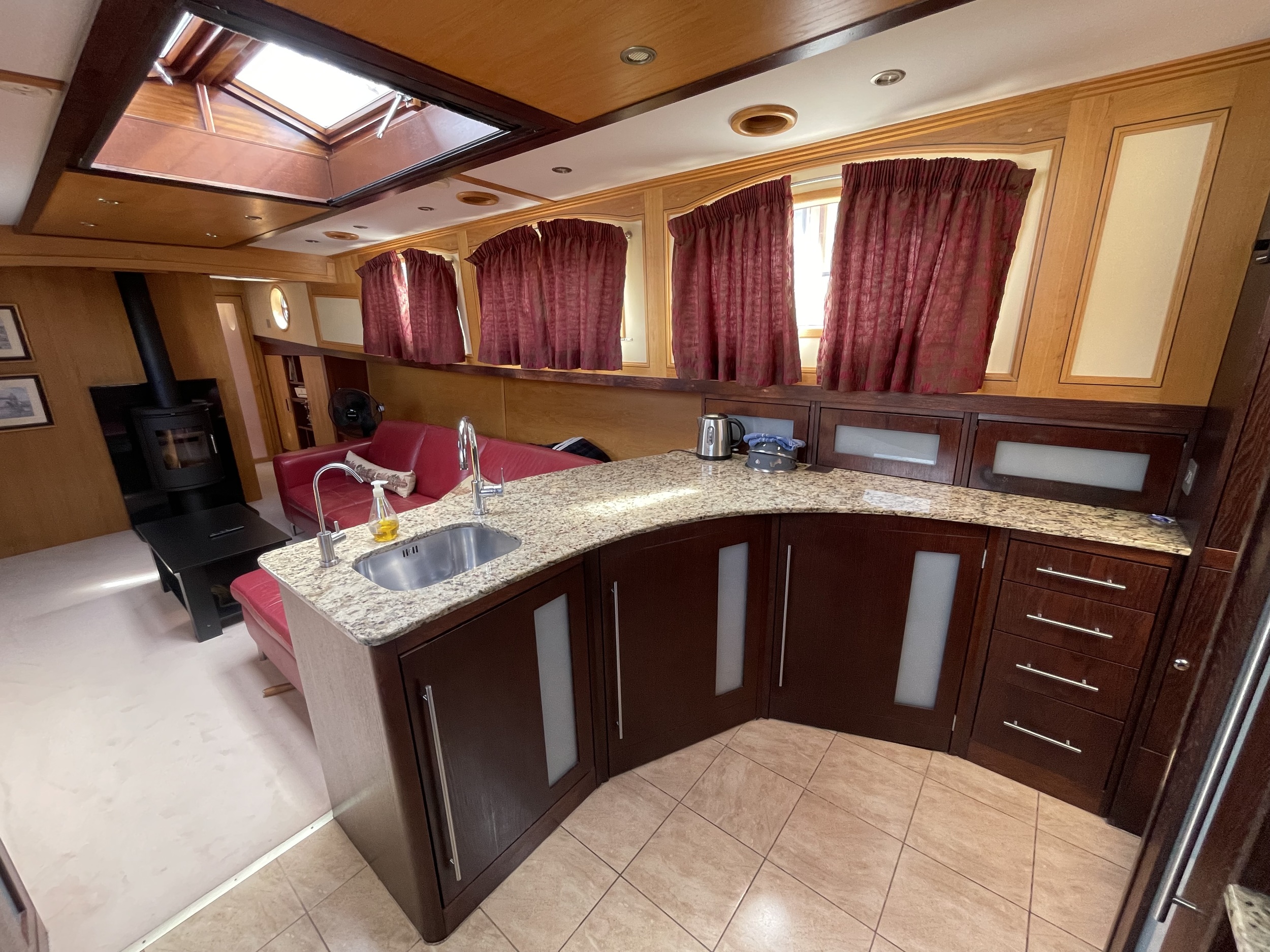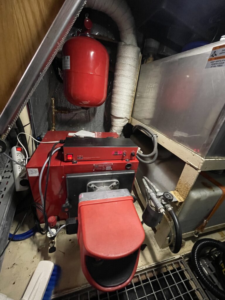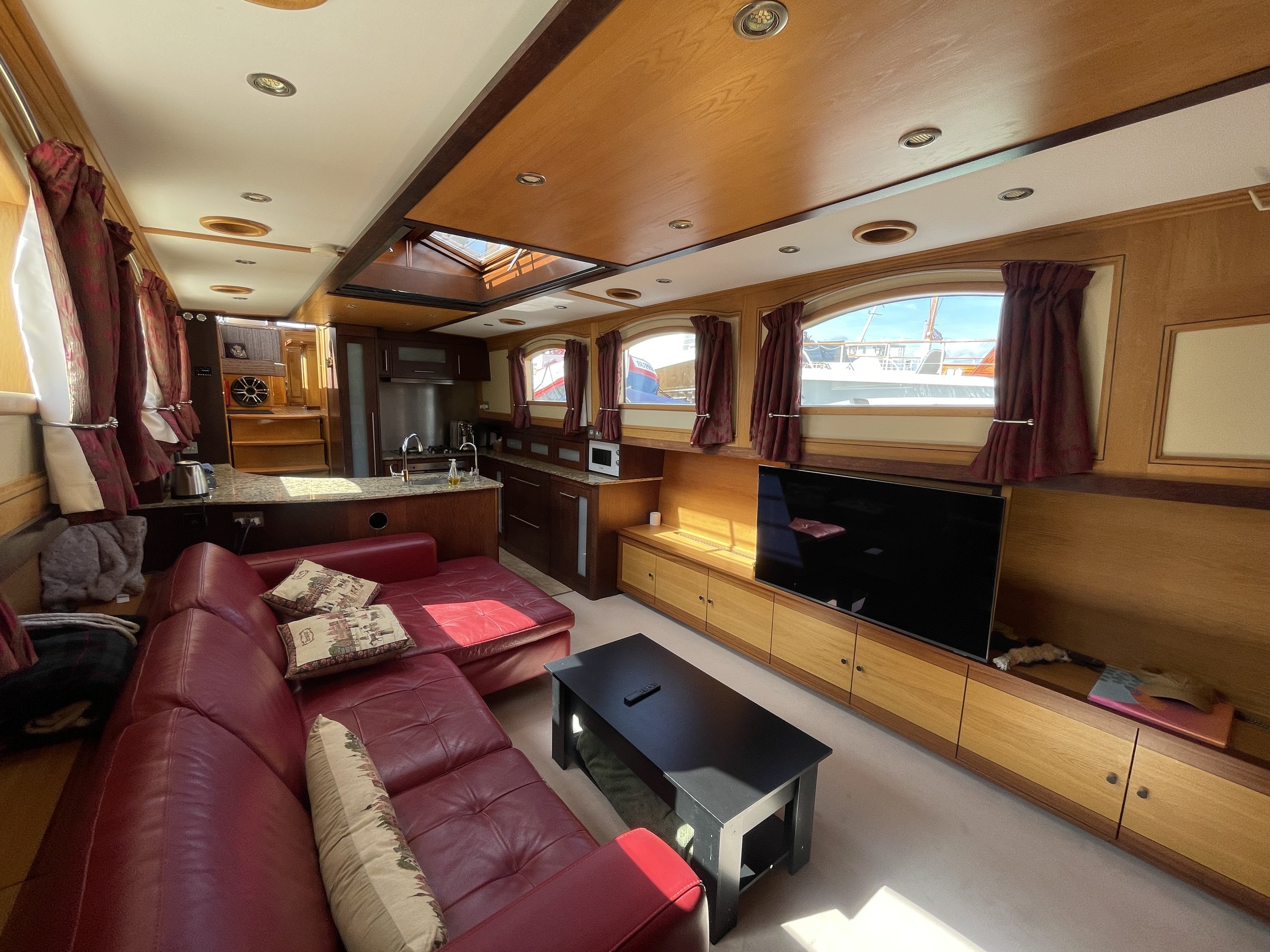 De ruime stuurhut werd in 2025 volledig vernieuwd met nieuw houtwerk, plafond, isolatie, bekabeling en moderne navigatieapparatuur, waaronder een Garmin-plotter met radar, AIS, marifoon en dieptemeter. De salon is sfeervol ingericht met een leren zithoek, houtkachel, grote ramen en een open keuken met granieten werkblad, 4-pits gasstel, oven, magnetron en koelkast/vriezer.