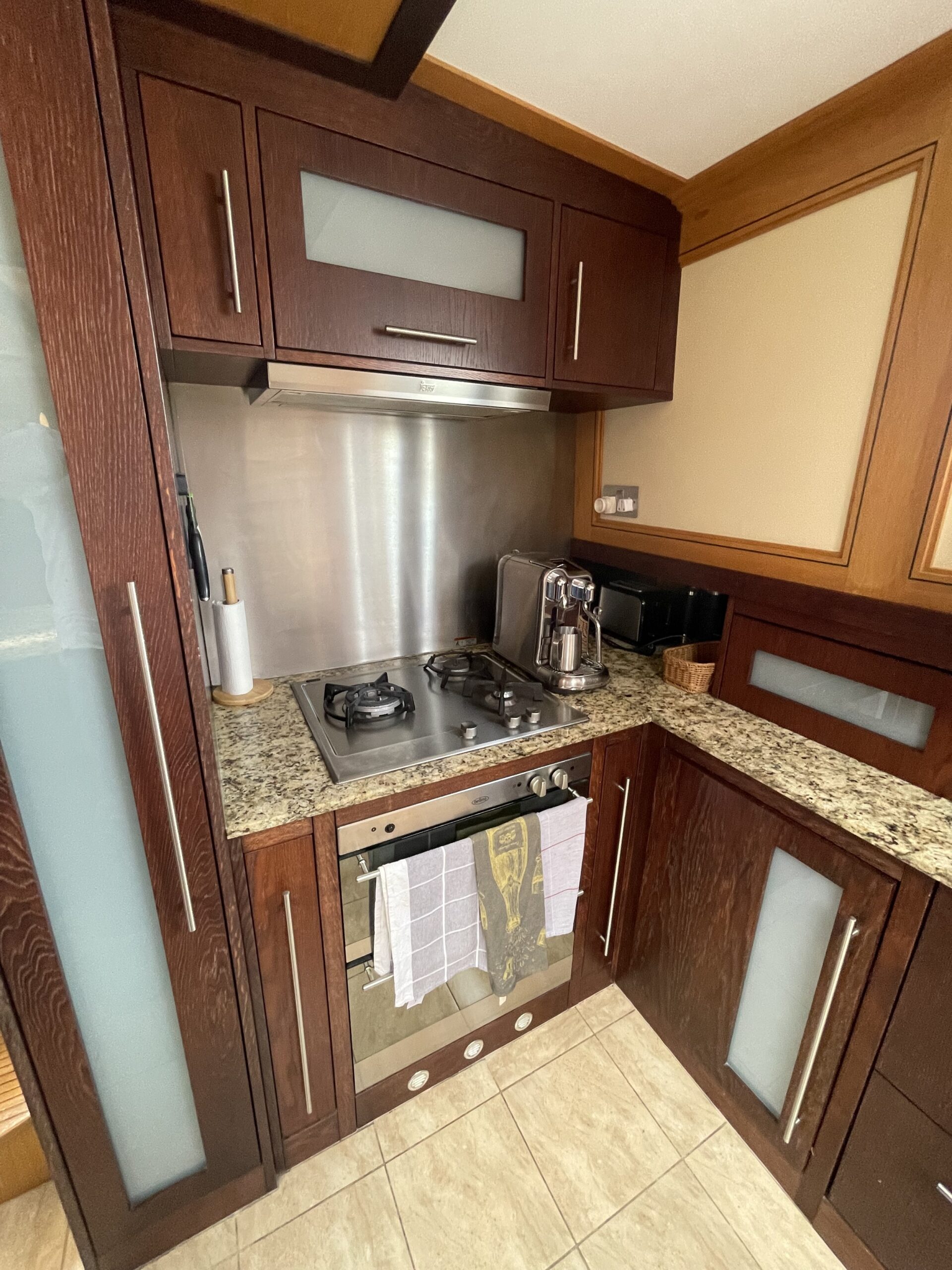 Kombuis: open keuken met granieten werkblad, 4-pits gasstel, oven, magnetron, koelkast/vriezer, RVS-spoelbak en veel kastruimte.