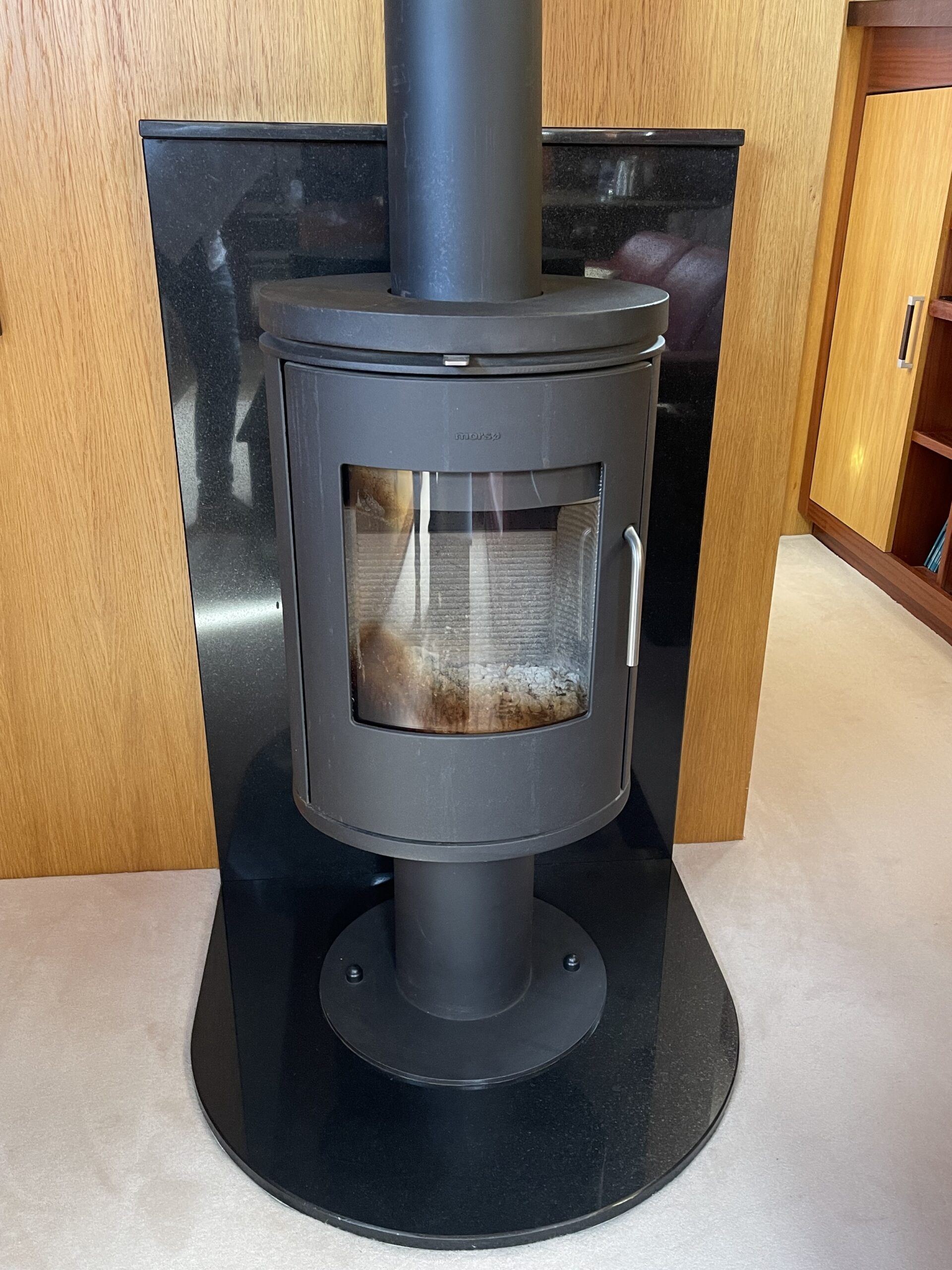 Salon: ruime leefruimte met leren hoekbank, grote ramen, TV-meubel en Morso houtkachel.