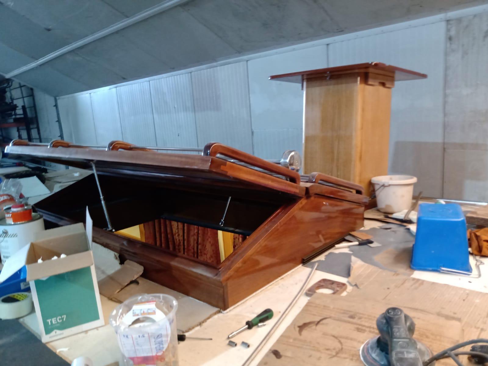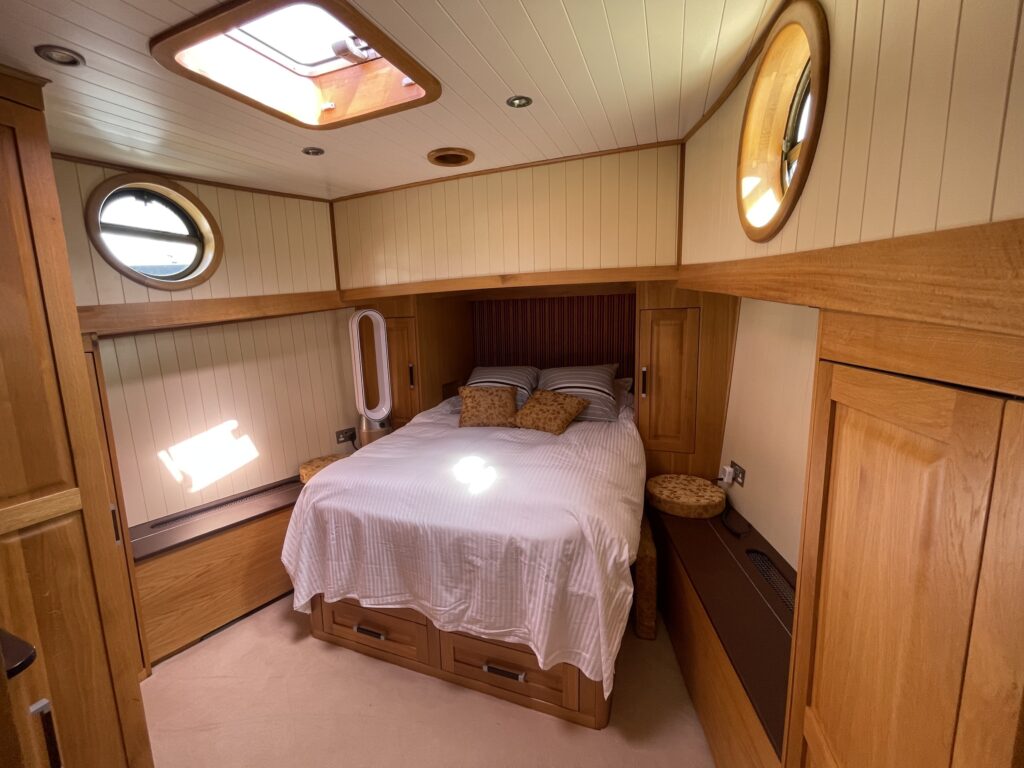 Stuurhut: in 2025 volledig vernieuwd met nieuw houtwerk, plafond, isolatie en bedrading. Grote ramen, dubbele deuren naar achterdek, zithoek en klaptafel.