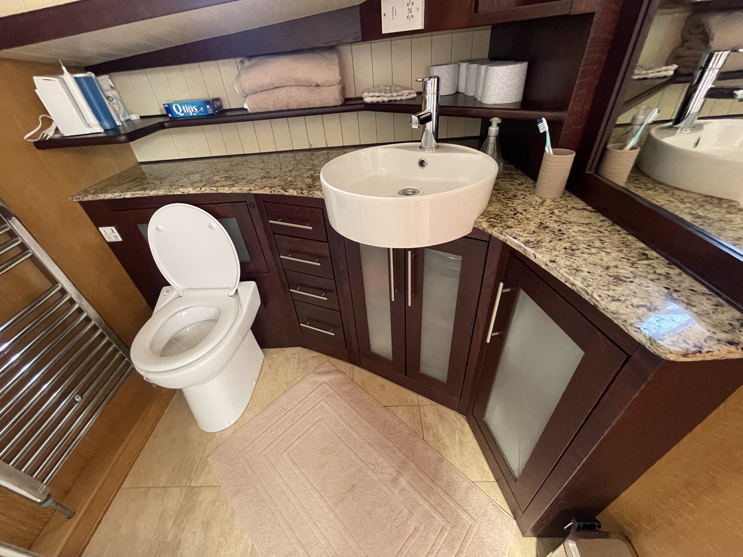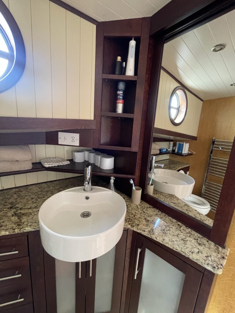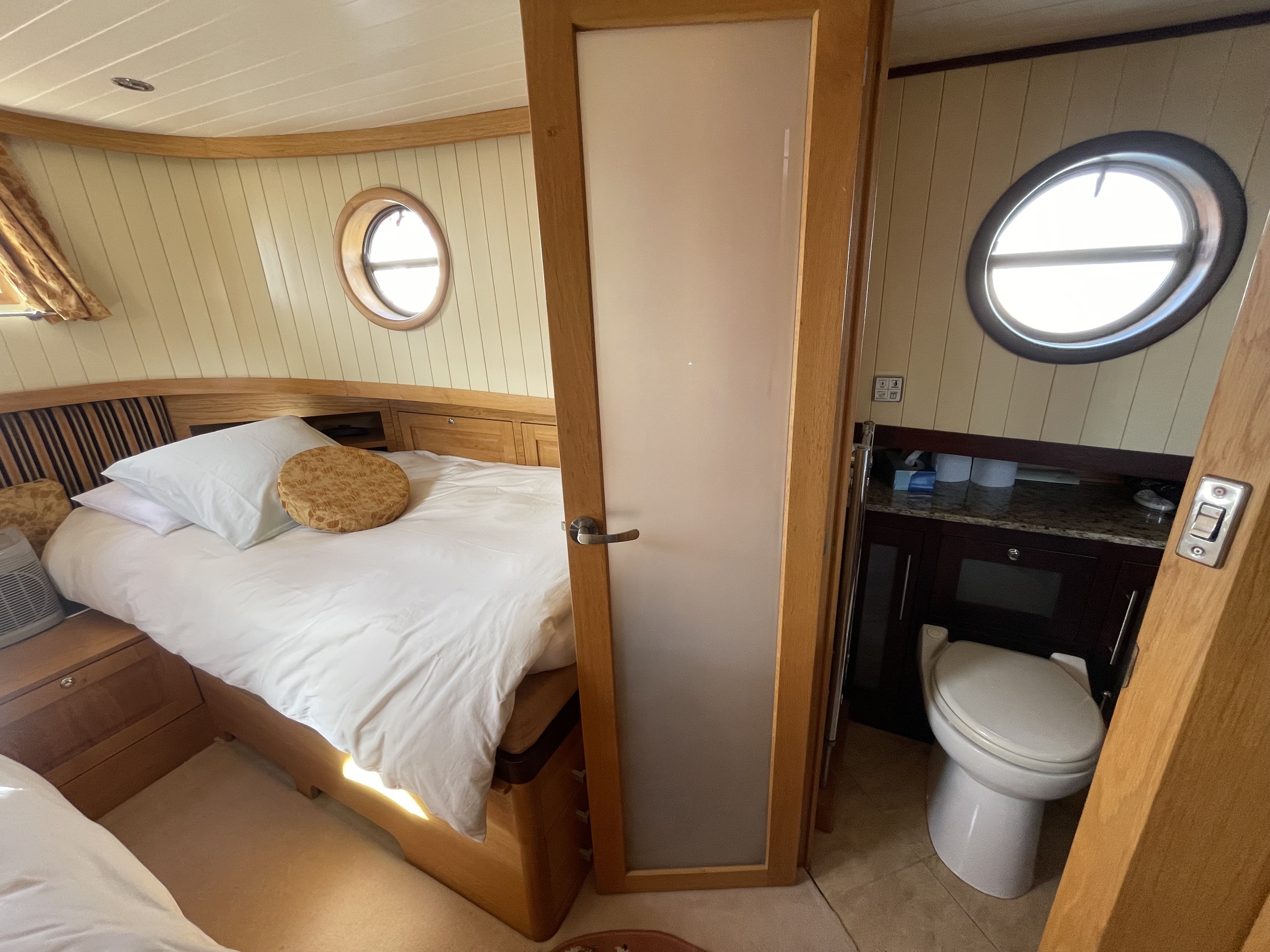 Beneden bevinden zich de comfortabele eigenaarshut in het voorschip met Frans bed en eigen badkamer met douche, wastafel en elektrisch toilet, en de gastenhut in het achterschip met twee enkele bedden en een aparte douche- en toiletruimte.
