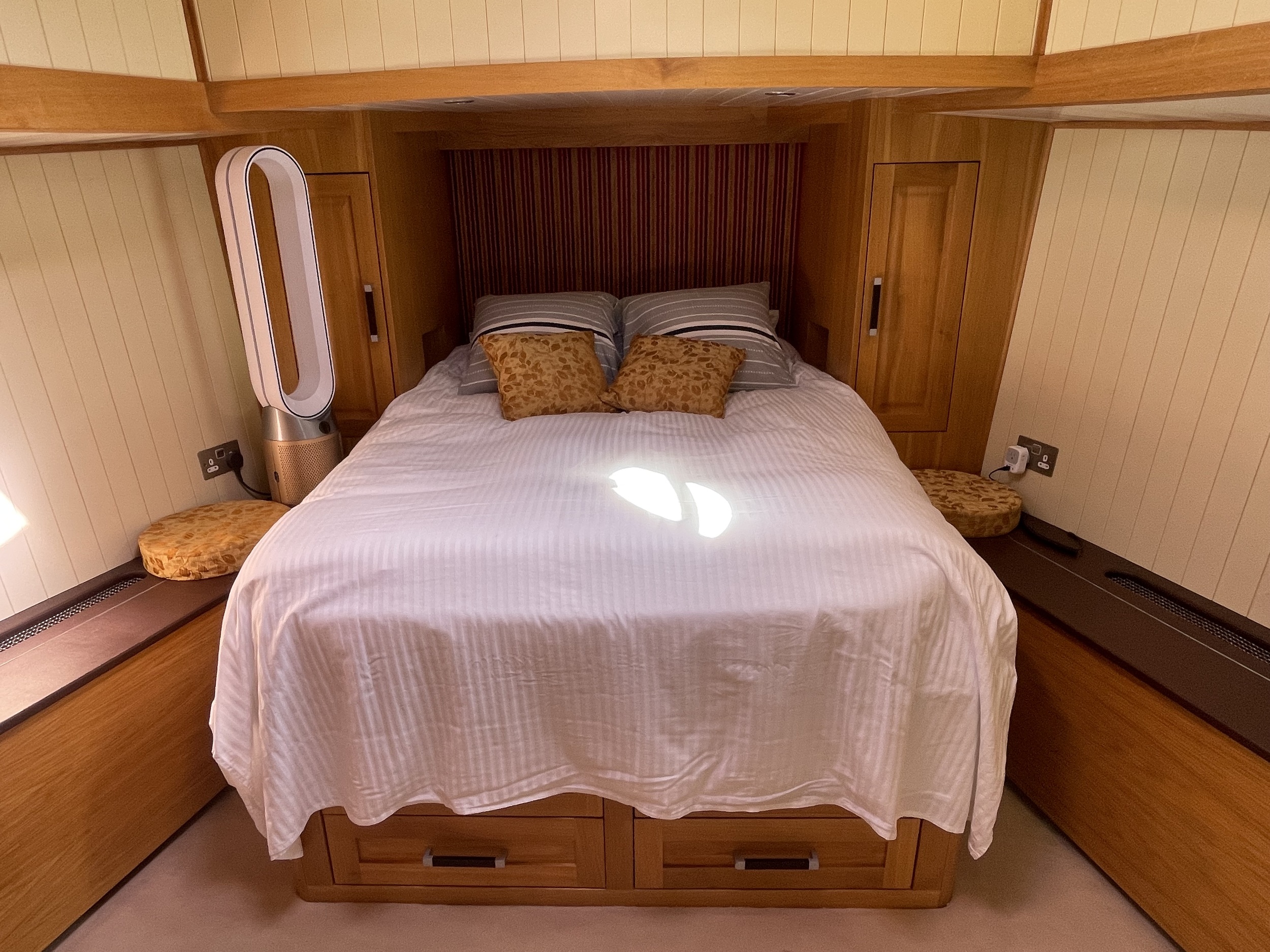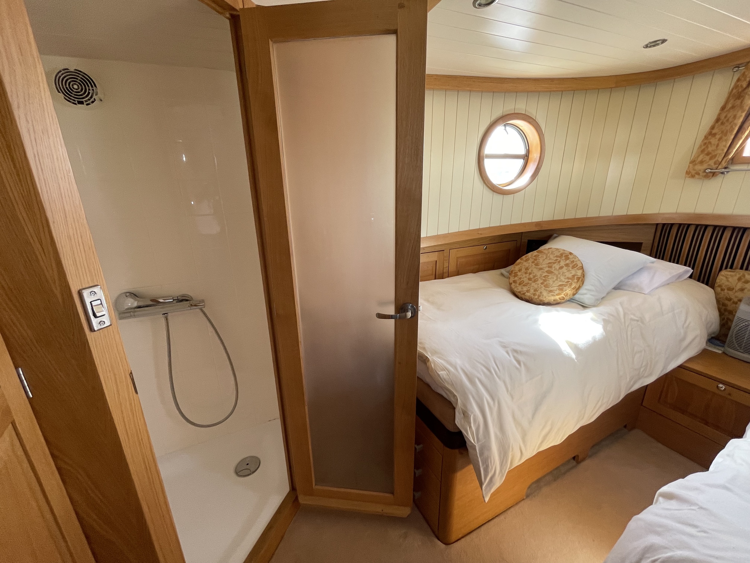 Eigenaarshut (voorin): tweepersoonsbed met lades, kasten en eigen badkamer met douche, wastafel en elektrisch toilet.