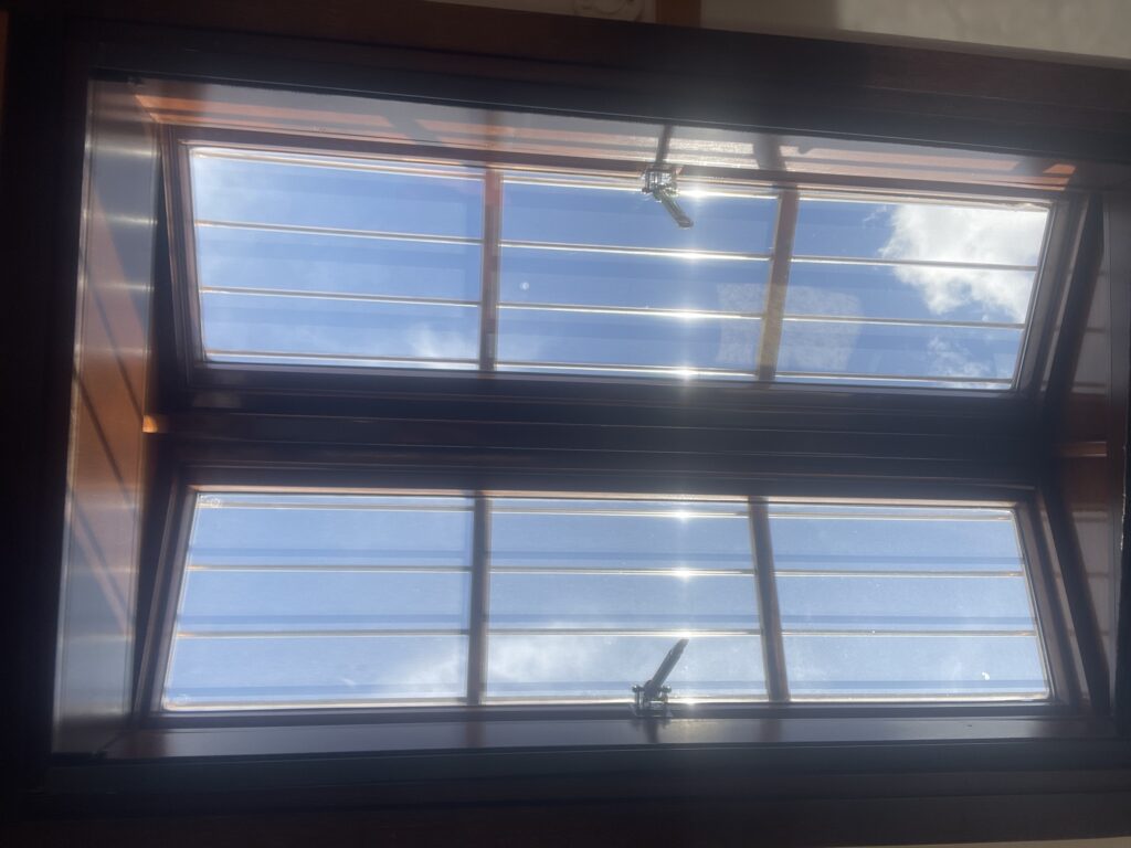Koekoek: klassieke massief houten lichtkoepel met RVS handgrepen en glas, geplaatst boven de salon voor extra daglicht en ventilatie.