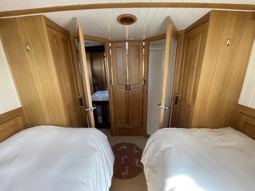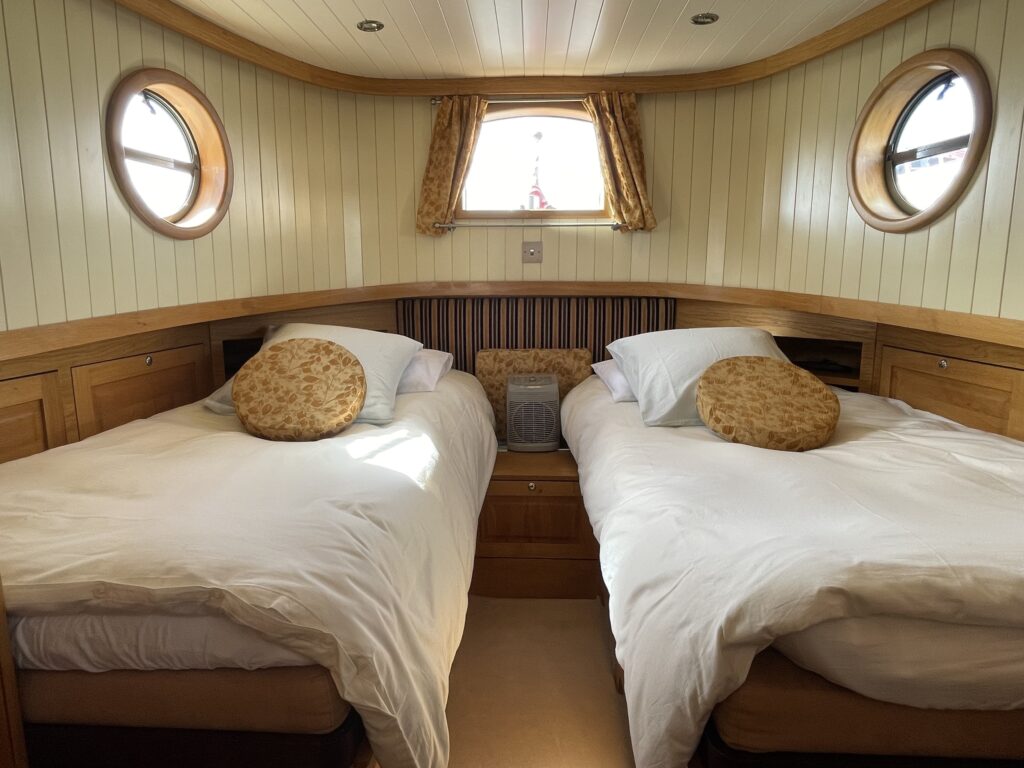 Gastenhut (achterschip): twee eenpersoonsbedden met opbergruimte, aparte douche en toiletruimte.