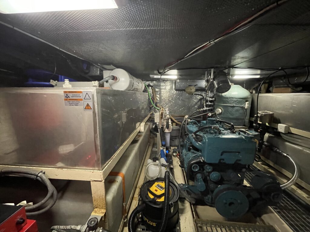 De technische installatie omvat een John Deere 6-cilinder dieselmotor, WhisperPower generator, boegschroef, dieselverwarming, warmwatersysteem, en een 12/24/230V elektrisch systeem met omvormer.